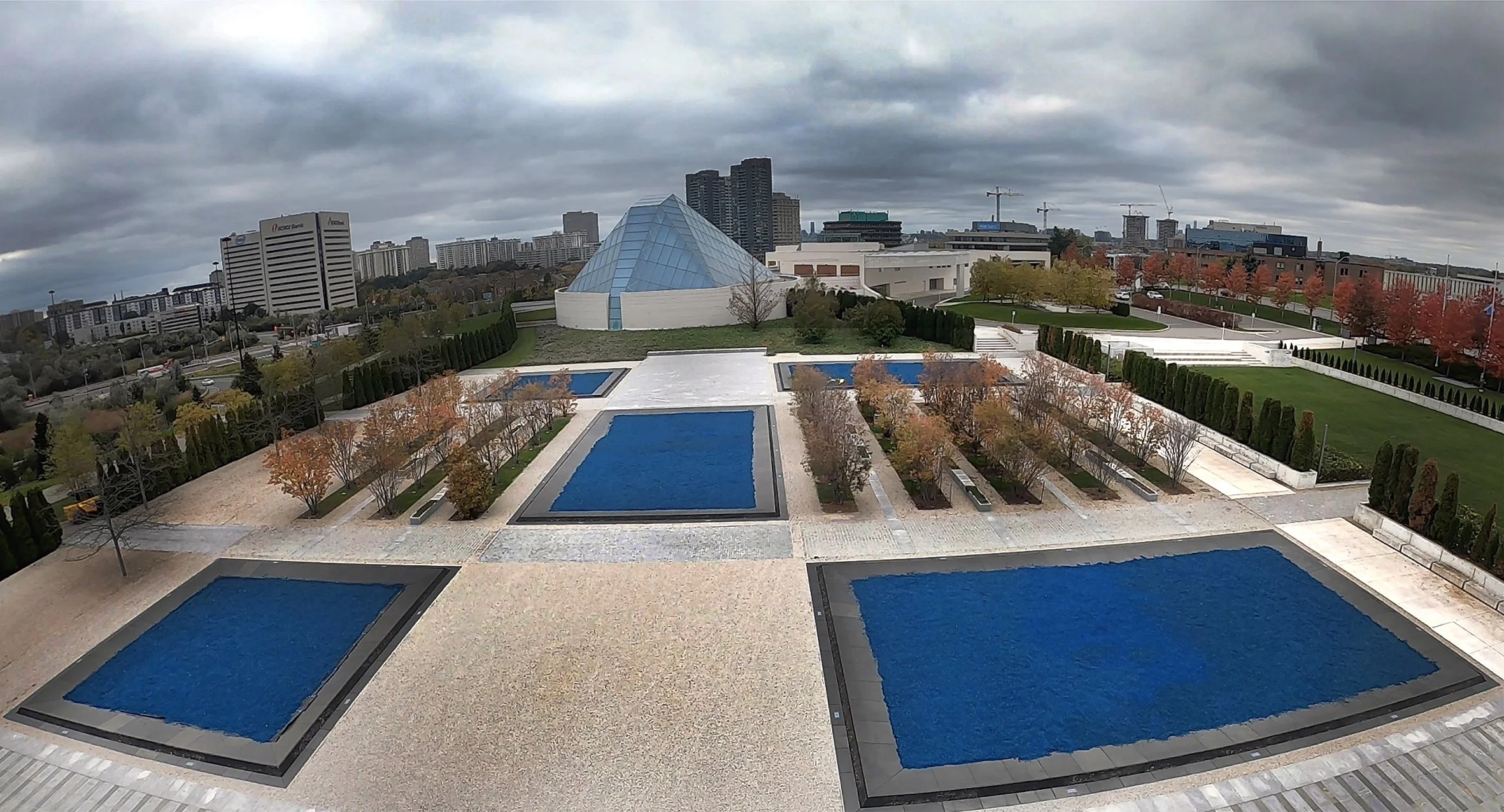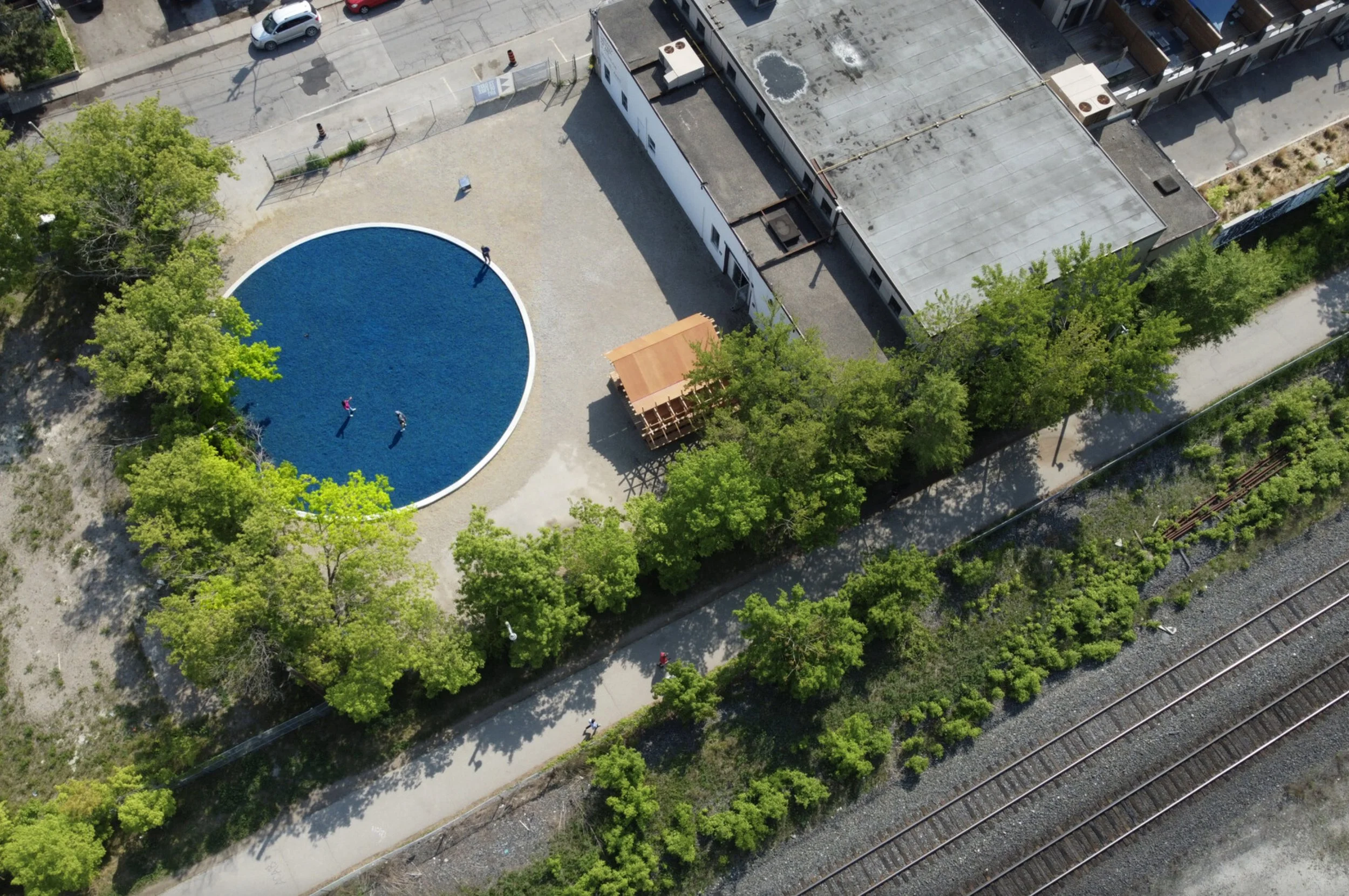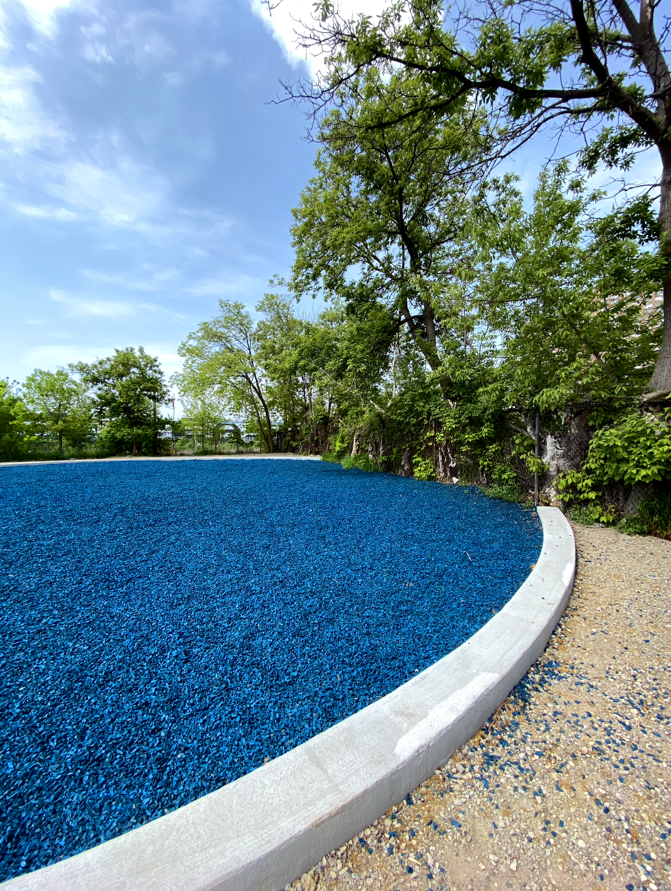 Forced Afloat is a public artwork composed of thousands of square feet of blue rubber mulch—the kind commonly used in children’s playgrounds to slow movement and cushion falls. When installed, the mulch’s vivid azure colour creates the illusion of a pool, a false body of water—an association reinforced by the title.