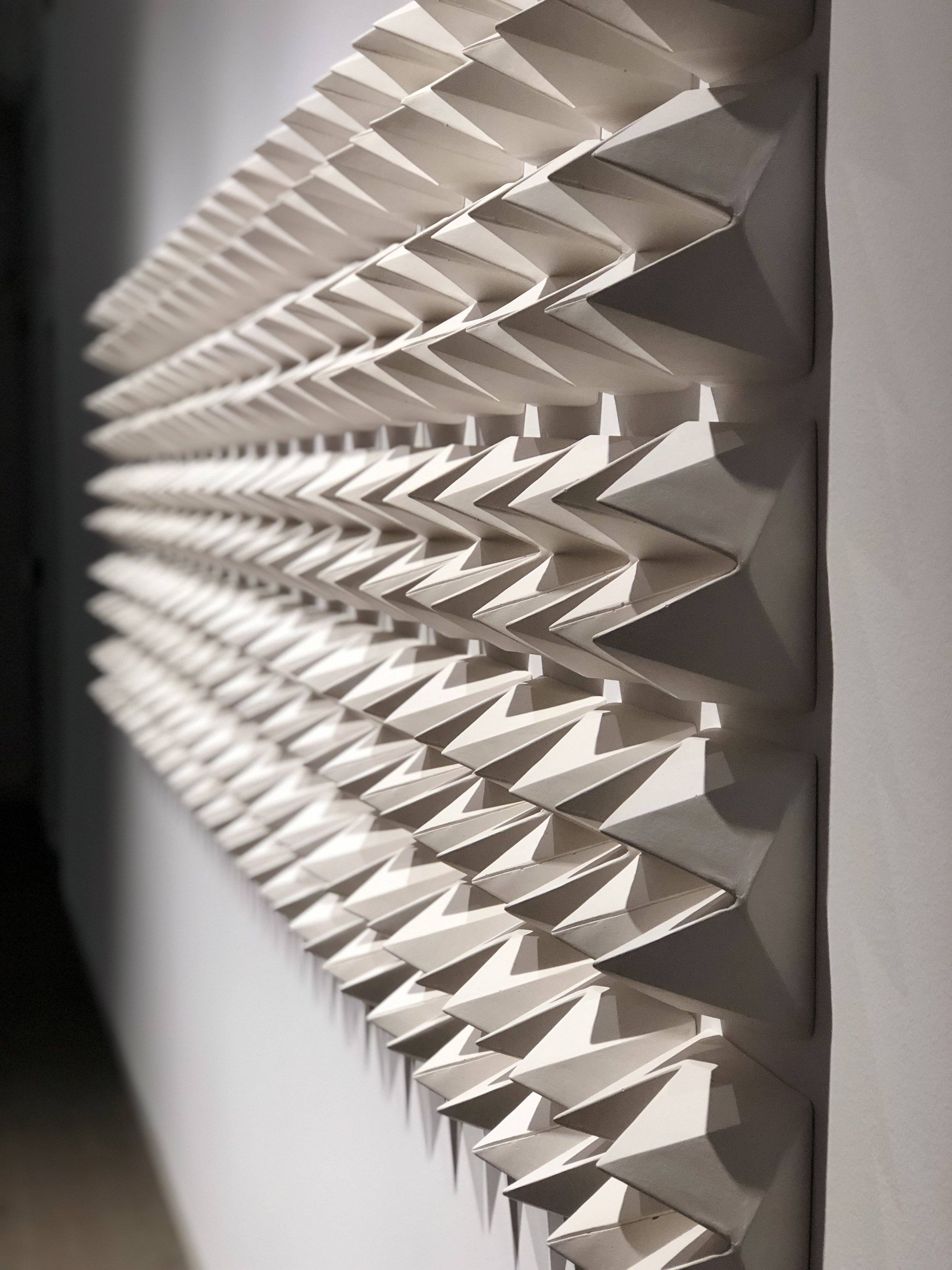 The absence of information to guide the viewer of Fortune Teller is conspicuous. The work refers to the origami paper game of chance that is used to predict the participants’ future. The repetition of form and the lack of any messaging invests the objects with a role open to speculation and endless possibilities. All these fortune-tellers appear to be the exact same object with the same message: nothingness. The process of cartomancy these objects are designed to encourage is thus reduced to a form of interpretation that allows the viewer to see nothing and everything at the same time.